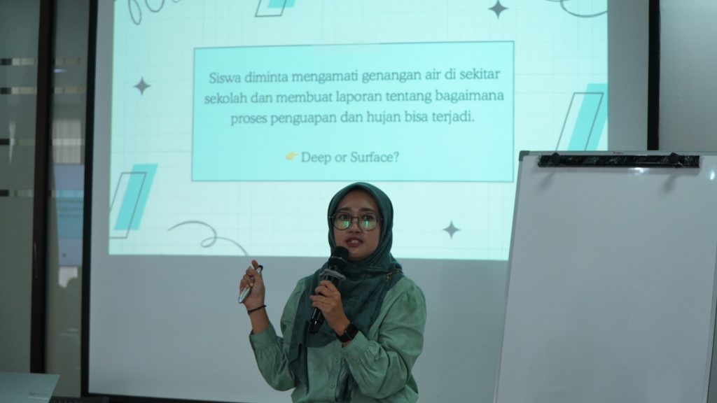 Pada sesi materi, Nuril Nuzulia, M.Pd (Dosen PGMI UIN Maulana Malik Ibrahim Malang) mengajak peserta diklat untuk memahami perbedaan antara surface learning dan deep learning melalui permainan interaktif.